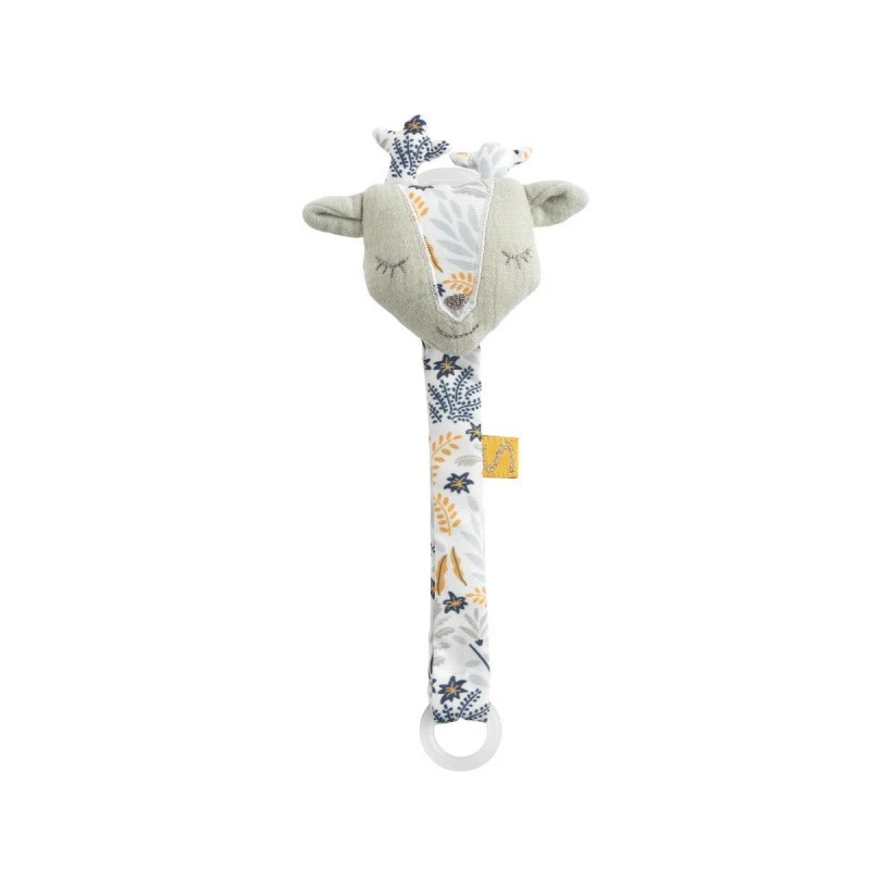 Promenons-nous est une collection pleine de charme, imaginĂ©e par Sauthon, qui fait planer une ambiance de sous-bois, avec sa vĂ©gĂ©tation colorĂ©e et ses discrets habitants au nombre desquels figure le daim magnifique reprĂ©sentĂ© sur cette attache-sucette.Â