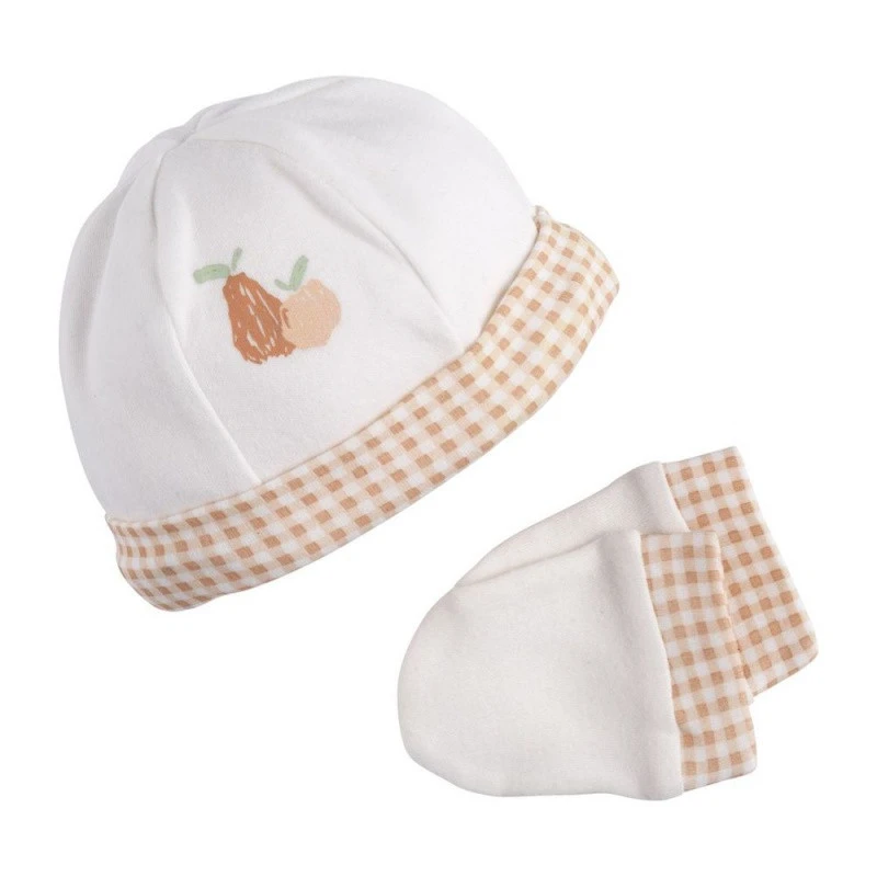 Élégants et modernes, le bonnet et les gants associent un adorable imprimé à petits carreaux orangés, et un uni blanc lumineux décoré de petits fruits. Petit plus : sa ravissante étiquette sur le côté, signée d’un S doré.