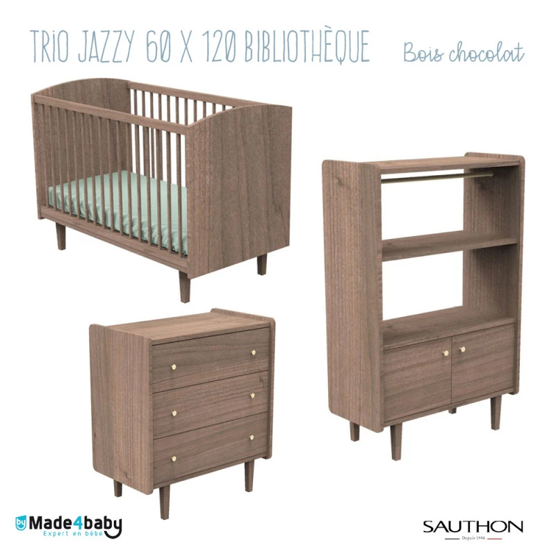Vous allez fondre pour la chambre Jazzy de Sauthon avec son décor bois chocolat, une couleur gourmande qui réchauffe immédiatement l’atmosphère et s’intègre aisément à toutes les ambiances, des plus claires au plus foncées, des plus sobres aux plus chamarrées. Aussi, la marque française a réuni dans ce trio magnifique, le lit 60 x 120 prêt à accueillir votre enfant de sa naissance à 3 ans environ, la commode 3 tiroirs et la bibliothèque 2 portes.