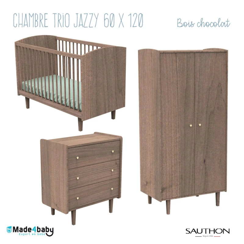 Vous allez fondre pour la chambre Jazzy de Sauthon avec son décor bois chocolat, une couleur gourmande qui réchauffe immédiatement l’atmosphère et s’intègre aisément à toutes les ambiances, des plus claires au plus foncées, des plus sobres aux plus chamarrées. Aussi, la marque française a réuni dans ce trio magnifique, le lit 60 x 120 prêt à accueillir votre enfant de sa naissance à 3 ans environ, la commode 3 tiroirs et l’armoire 2 portes.