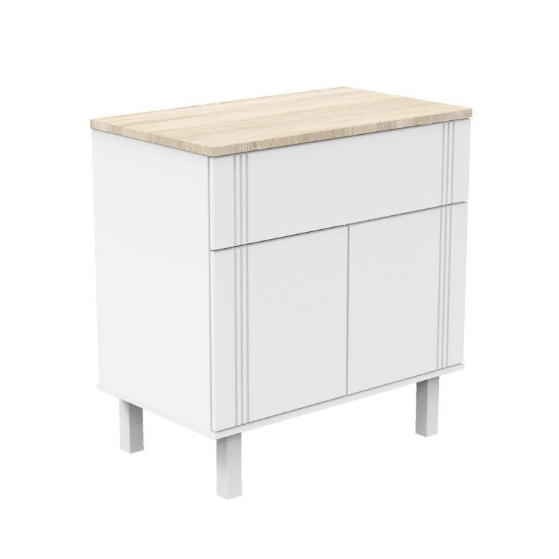- Portes, face tiroir, cotés, et dessous en panneaux de fibres moyenne densité (MDF) laqués Blanc.
