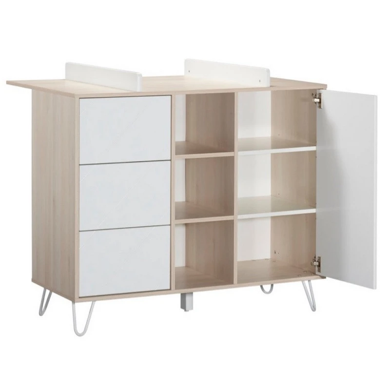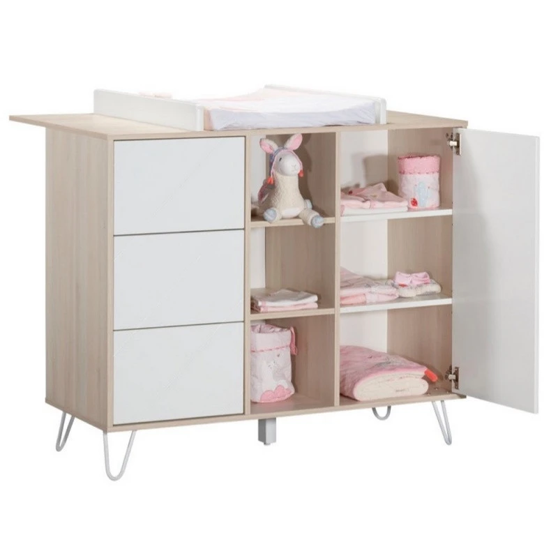 Cette belle commode assortie Ă la nouvelle collection Happy de Sauthon est extrèmement spacieuse. Elle est composĂ©e de 3 tiroirs, 3 niches et d’une petite porte cachant 3 Ă©tagères. Elle accueillera toutes les petites affaires de bĂ©bĂ© et vous permettra de les garder Ă portĂ©e de main. Avec son design simple et Ă©purĂ©, la commode Hello conçue par Sauthon est Ă©galement très pratique. En effet, vous pourrez la transformer en commode Ă langer en fixant simplement le plan Ă langer assorti Ă la collection (en option). Vous pourrez ainsi profiter d’un espace de langer confortable et sĂ©curisĂ© pour vous occuper de bĂ©bĂ© en toute sĂ©rĂ©nitĂ©. Afin d’utiliser la commode en toute sĂ©curitĂ©, elle doit ĂŞtre fixĂ©e au mur (sangle fournie). Petit plus Sauthon très pratique: les tiroirs sont Ă©quipĂ©s du système push!