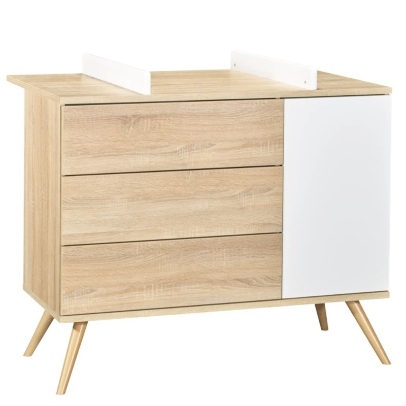 Cette belle commode assortie à la collection Seventies de Sauthon est très spacieuse. Elle est composée d’une porte et de 3 tiroirs. Elle accueillera toutes les petites affaires de bébé et vous permettra de les garder à portée de main. Avec son design doux et rétro, la commode Seventies conçue par Sauthon est également très pratique. En effet, vous pourrez la transformer en commode à langer en fixant simplement le plan à langer assorti à la collection (en option). Vous pourrez ainsi profiter d’un espace de langer confortable et sécurisé pour vous occuper de bébé en toute sérénité. Afin d’utiliser la commode en toute sécurité, elle doit être fixée au mur (sangle fournie). Petit plus Sauthon très pratique: les tiroirs sont équipés du système push!
