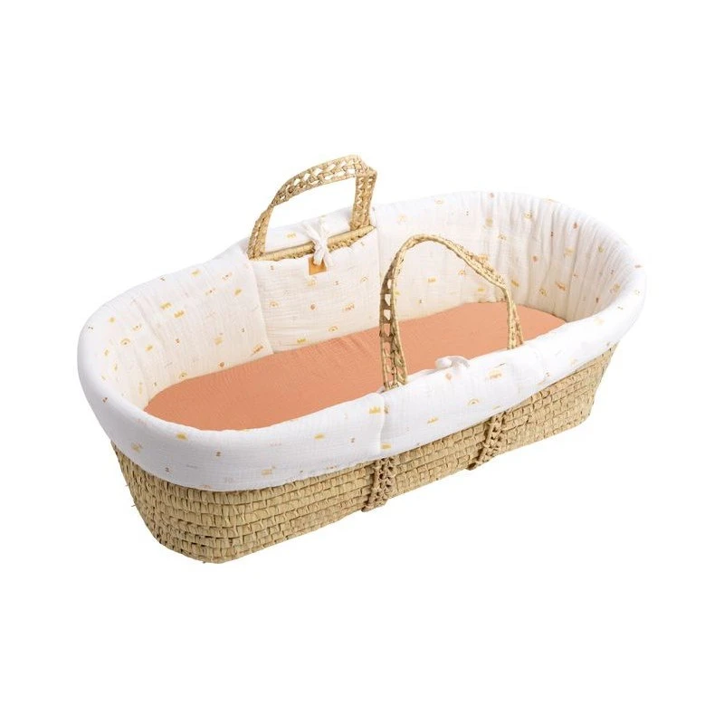 Utilisable dès votre retour de la maternité, son panier en fibres naturelles de palmier est fourni avec un habillage et une housse de matelas en coton, ainsi que d’un matelas bien confortable pour dormir sereinement à côté de maman.
