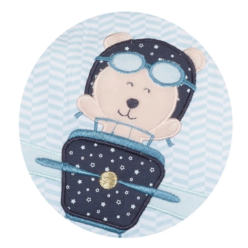 Coloris : Bleu ciel, turquoise et liseret bleu marine. Motif ourson Lazare dans son avion.