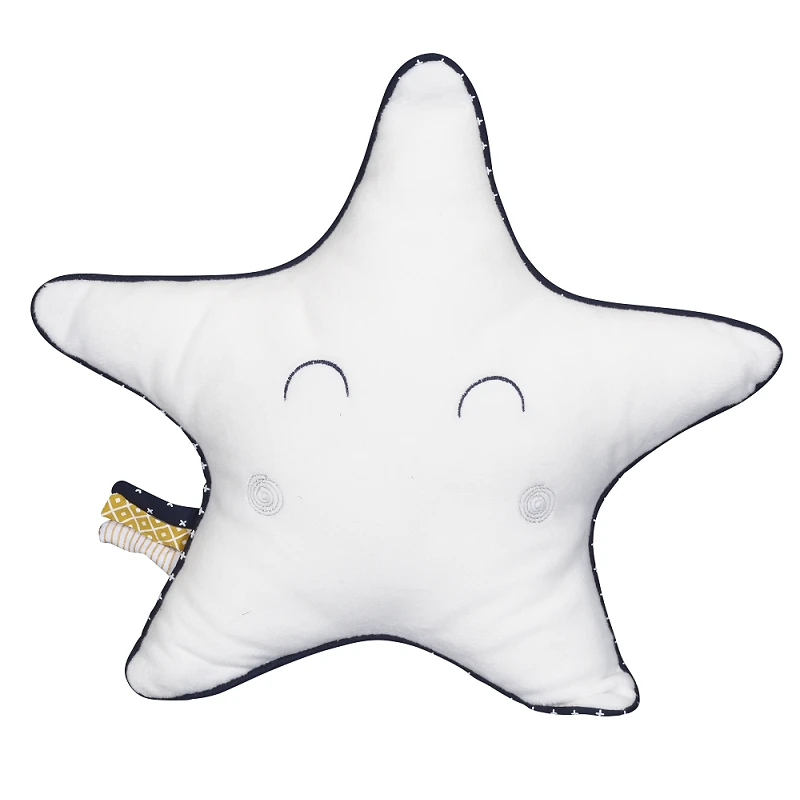 Découvrez le joli coussin décoratif en popeline imprimée et velours assorti à la collection Hello par Sauthon. Dans les tons de blanc avec un joli liseré marine, ce beau coussin en forme d’étoile est trop mignon avec ses yeux endormis et ses pomettes en spirale ! Tout doux et moelleux, bébé sera ravi de se coucher dessus ! Coordonné aux autres éléments du thème Hello, il apportera une touche de déco dans la chambre de l’enfant. Un beau cadeau original qui fera autant plaisir à bébé qu’à ses parents !