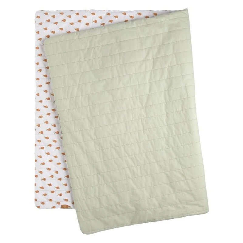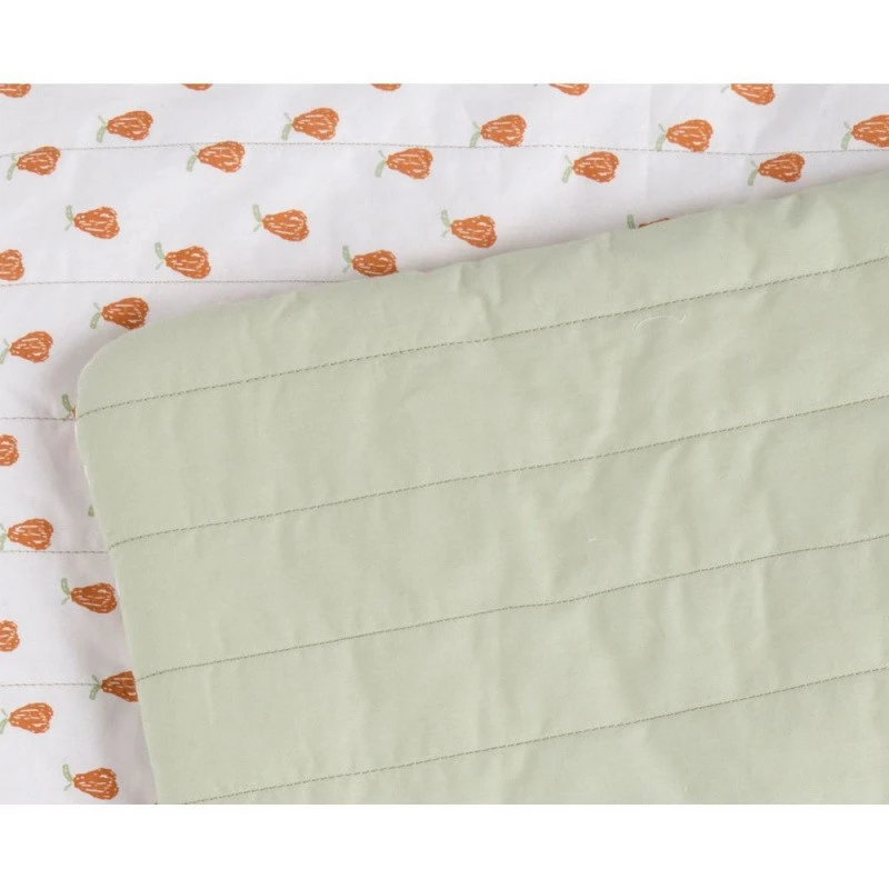 Pour réaliser ce couvre-lit Botanica, Sauthon a choisi d’associer un coton uni vert sur une face, un imprimé recouvert de poires sur l’autre, un rembourrage moelleux en polyester entre les deux, et un biais élégant tout autour. Ajoutez les coussins en forme de fruits de la même collection, et offrez ainsi à votre bout de chou une chambre chaleureuse et confortable !