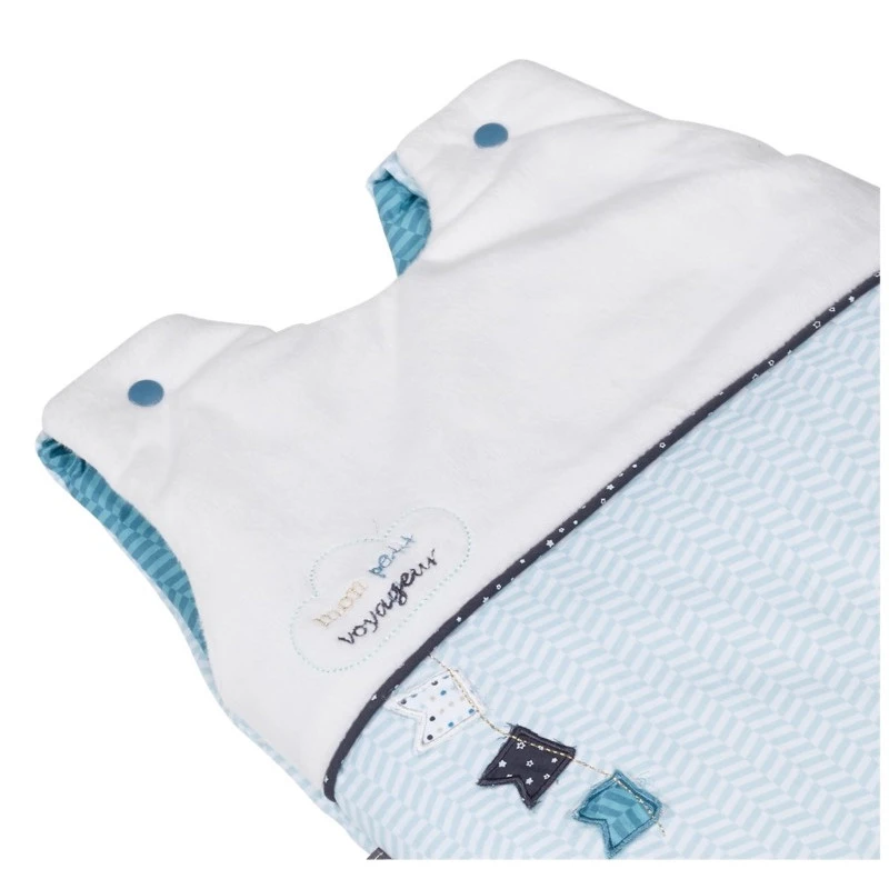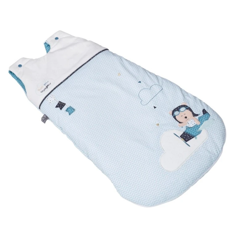 Mix parfait entre chaleur, confort et design, la petite gigoteuse assortie à la collection Lazare de Sauthon est en velours sur le plastron et en popeline sur la reste de la surface. Parfaite pour les enfants de la naissance à 4 mois, la gigoteuse ouatinée New Lazare s’utilise en hiver pour couvrir bébé dans son lit, il pourra gigoter à loisir sans jamais se découvrir. Pour filer tout droit au pays des rêves Sauthon a orné sa gigoteuse New Lazare du petit ourson pilote qui plane au milieu des nuages. La gigoteuse Naissance New Lazare est très simple d’utilisation avec ses boutons pression au niveau des épaules et sa fermeture éclair sur le côté, vous pourrez la manipuler sans réveiller bébé. Pour un hiver bien au chaud, n’oubliez pas de glisser la gigoteuse ouatinée New Lazare dans votre liste de naissance.
