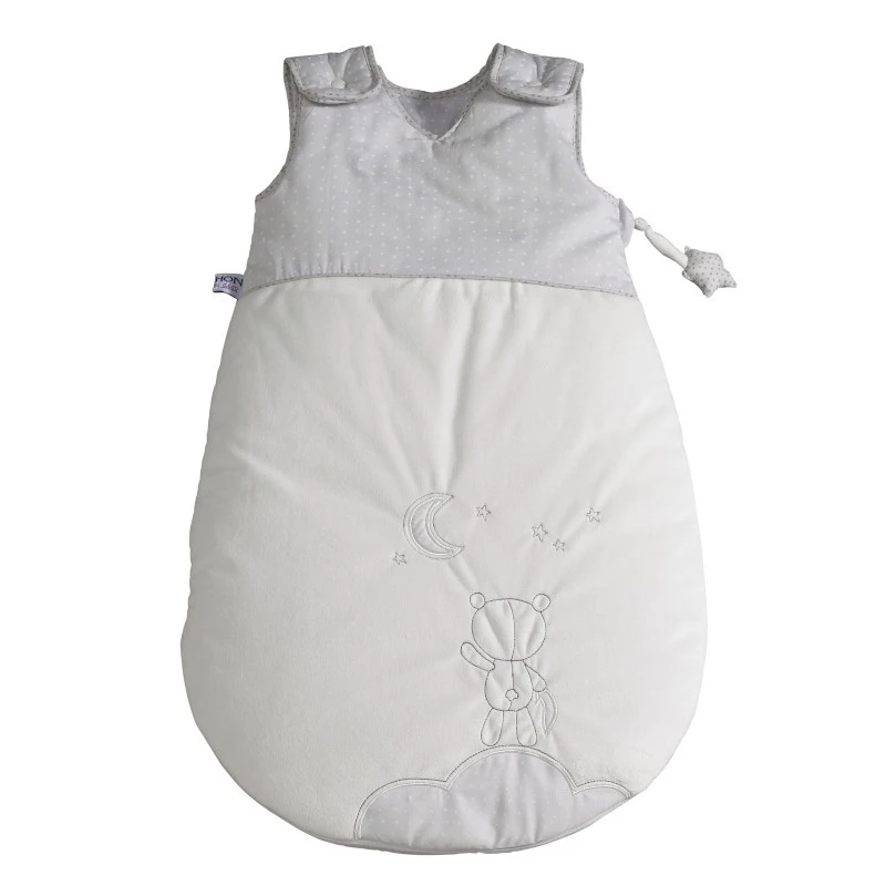 La gigoteuse 0-4 mois par Sauthon est idéale pour garder bébé au chaud pendant son sommeil sans jamais se découvrir. Sans manche, elle permet de laisser circuler l’air tout en apportant douceur et chaleur à l’enfant. L’ouverture par bouton pression sur les épaules ainsi que la fermeture éclair sue le côté de la gigoteuse facilitent l’installation de bébé. L’utilisation de couverture ou de couette étant déconseillée jusqu’à l’âge de 18 mois, la gigoteuse est la solution idéale. Dans les tons de blanc et de gris étoilé, on y retrouve notre copain Céleste le petit ourson avec son doudou à la main qui fait coucou à sa copine la lune, entourée d’étoiles.