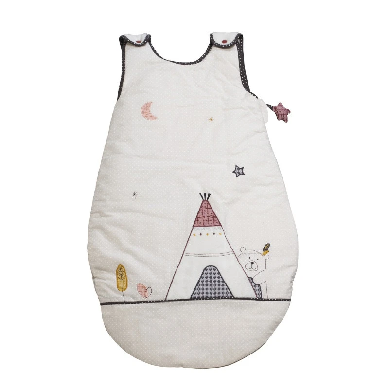 La gigoteuse 0-4 mois par Sauthon est idéale pour garder bébé au chaud pendant son sommeil sans jamais se découvrir. Sans manche, elle permet de laisser circuler l’air tout en apportant douceur et chaleur à l’enfant. L’ouverture par bouton pression sur les épaules ainsi que la fermeture éclair sue le côté de la gigoteuse facilitent l’installation de bébé. L’utilisation de couverture ou de couette étant déconseillée jusqu’à l’âge de 18 mois, la gigoteuse est la solution idéale. Dans les tons d’écru à petits pois blancs avec un joli liseré marron, on y retrouve notre copain Timouki le petit ours indien qui se cache derrière son beau Tipi joliment décoré dans la nuit étoilée ! Un beau cadeau très pratique pour passer un hiver bien au chaud !