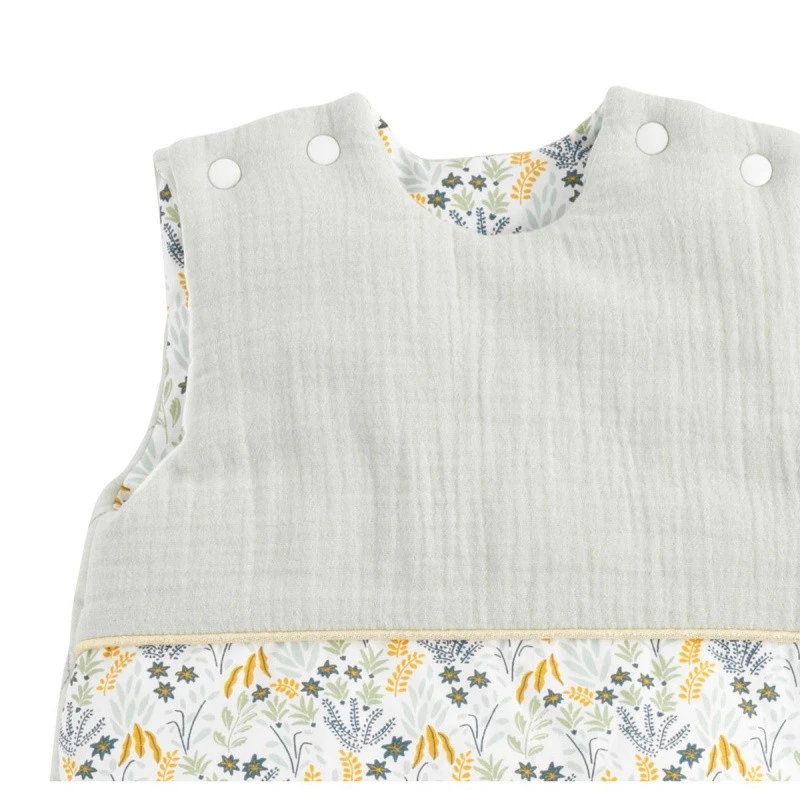 Cette jolie gigoteuse de la collection Promenons-nous est destinée aux enfants entre 0 et 6 mois. La marque Sauthon a choisi de lui donner un look résolument moderne en optant pour un magnifique imprimé végétal, associé à un tissu uni sur le plastron, le tout dans une déclinaison de couleurs naturelles, vert, bleu et jaune.