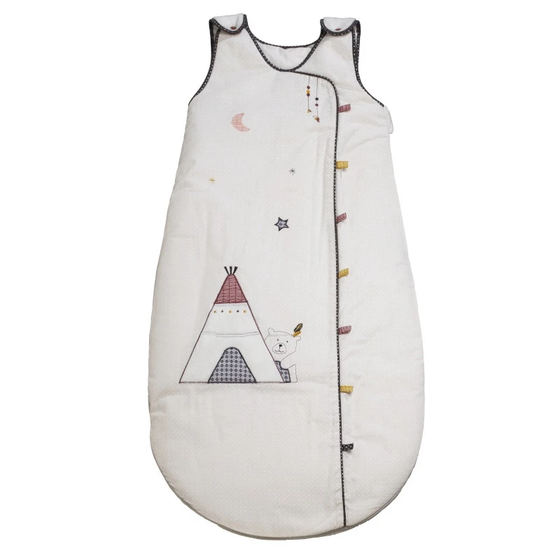 La gigoteuse 4-24 mois par Sauthon est idéale pour garder bébé au chaud pendant son sommeil sans jamais se découvrir. Sans manche, elle permet de laisser circuler l’air tout en apportant douceur et chaleur à l’enfant. L’ouverture par bouton pression sur les épaules ainsi que la fermeture éclair sur le côté de la gigoteuse facilitent l’installation de bébé. L’utilisation de couverture ou de couette étant déconseillée jusqu’à l’âge de 18 mois, la gigoteuse est la solution idéale. Dans les tons d’écru à petits pois blancs avec un joli liseré marron, on y retrouve notre copain Timouki le petit ours indien qui se cache derrière son beau Tipi joliment décoré dans la nuit étoilée ! Un beau cadeau très pratique pour passer un hiver bien au chaud !