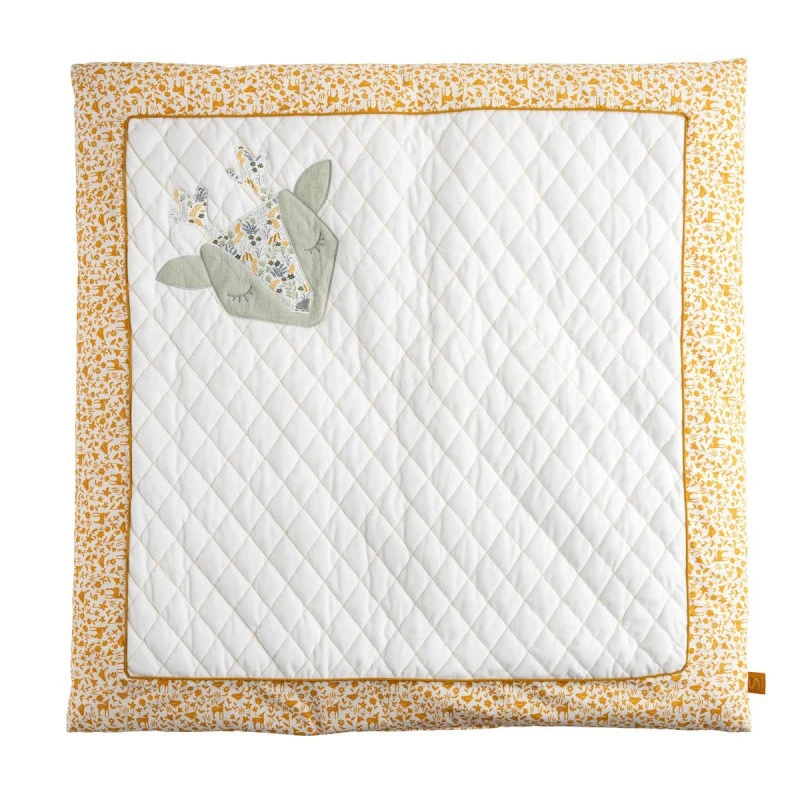 Découvrez ce grand tapis de la collection Promenons-nous, aussi confortable que décoratif ! Sauthon a choisi de lui donner un look original et moderne, en associant des imprimés raffinés, qui font souffler un petit air de sous-bois. Le premier est utilisé sur le pourtour du tapis, et il est parsemé all-over de faons ou d’oiseaux parmi la végétation, le tout dans une lumineuse teinte jaune topaze. Le second tissu à motifs mêle plusieurs teintes naturelles et il est présent sur la tête du daim héros de la collection.