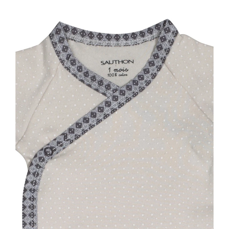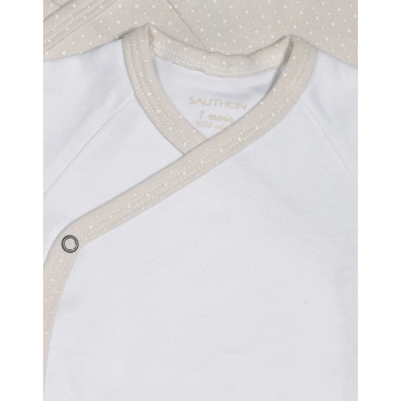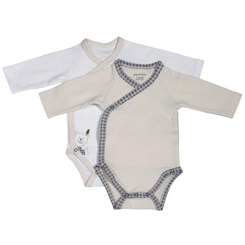 Le lot de 2 bodies assortis à la collection Timouki par Sauthon, fabriqués à 100% en jersey de coton, sont doux et confortable. Leur forme croisée ainsi que leurs boutons pression permettent de changer bébé très facilement et sans gêner bébé.