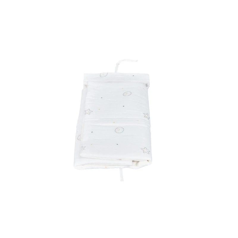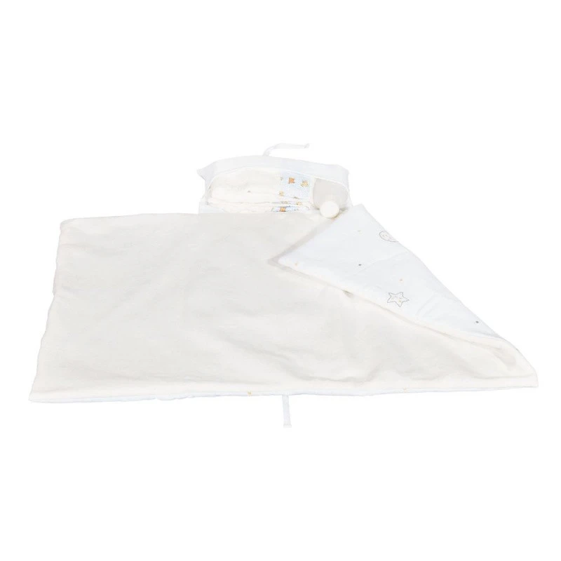 Ce matelas à langer de voyage assorti à la collection Babyfan par Sauthon est très pratique pour changer bébé ou que vous vous trouviez ! Elle se pose sur toutes les surfaces pour les protéger (les draps d’un lit par exemple) ou pour protéger bébé des surfaces froides et des bactéries. Fabriquée d’un côté en mousseline de coton bio et de l’autre en éponge imperméable, ce matelas à langer est très confortable grâce à son espace de change rembourré. Le matelas à langer de voyage est équipée d’une poche pour y ranger lingettes, couches, crèmes, etc… Pratique, il se replie pour prendre la forme d’une pochette à glisser dans le sac ! Dans les tons de blanc, il est recouvert d’étoiles et de lunes !