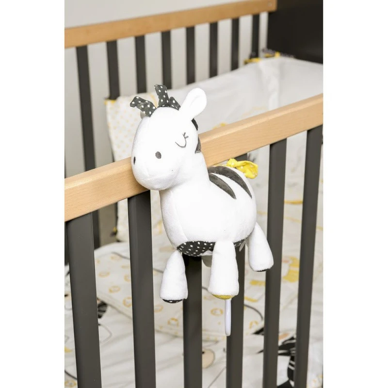 Faites la connaissance de Pluche, l’élégant zèbre qui arbore fièrement son beau pelage noir et blanc sur la collection imaginée par Sauthon. Accompagné de son ami Pompon, le gros lion tendre, il enjolive les différents éléments de cette gamme conçue pour décorer la chambre de votre bébé, l’habiller avec douceur les premiers mois, ou encore lui procurer de délicieux moments de détente grâce notamment au mini-musical Pluche Sauthon Pluche et Pompon.