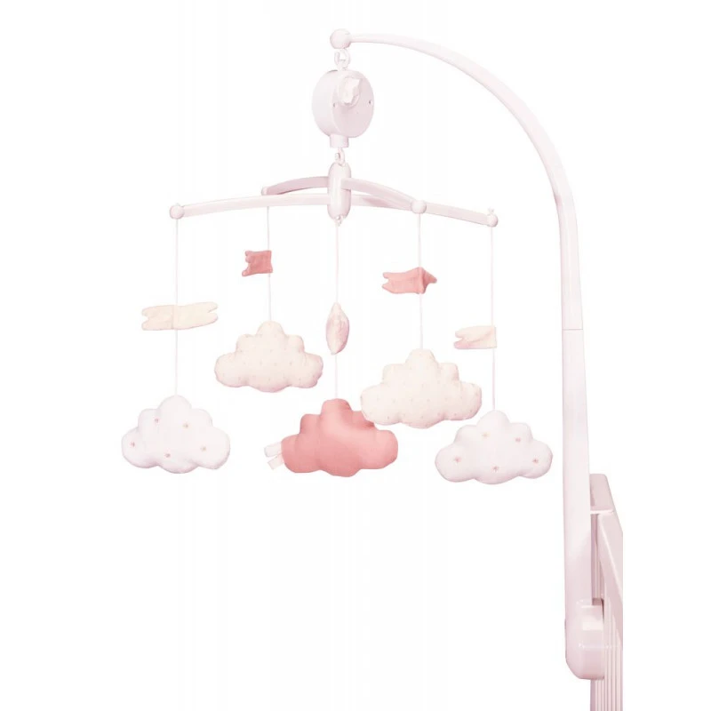 Dans les tons de rose, on y retrouve quatre petits nuages décorées par de petites étoiles ! Ils sont surmontés d’une belle étoile et de petits drapeaux, de quoi faire de beaux rêves ! Vous allez craquer sur ce joli mobile aux notes douces et poétiques ! Très beau cadeau pour une naissance !
