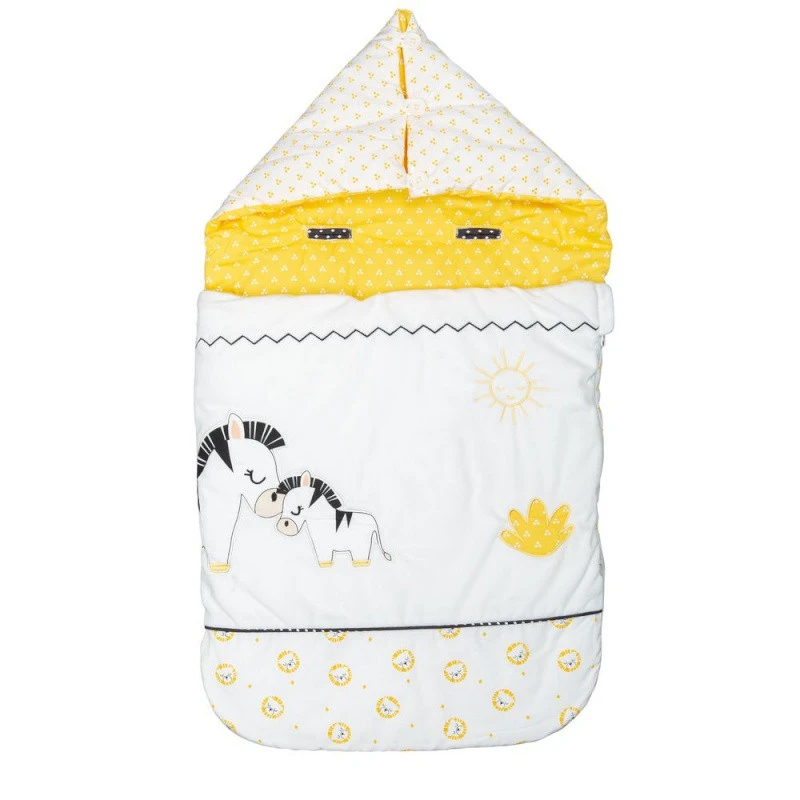 Le nid d’ange Sauthon Pluche et Pompon est aussi joli que pratique ! Sur fond blanc, il juxtapose un imprimé de fins motifs jaunes sur la capuche, un autre constellé de jolies têtes de lions sur le bas, et deux adorables zèbres au milieu. Réalisé avec des tissus certifiés Oeko-tex, il garantit le plus grand respect pour la santé et la peau délicate de votre bout de chou.