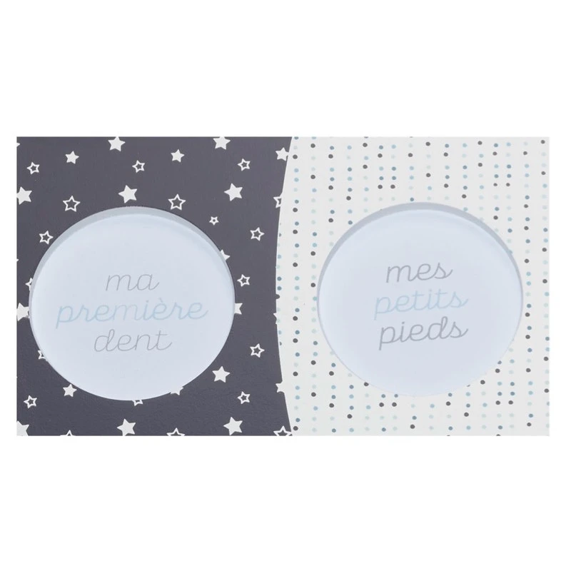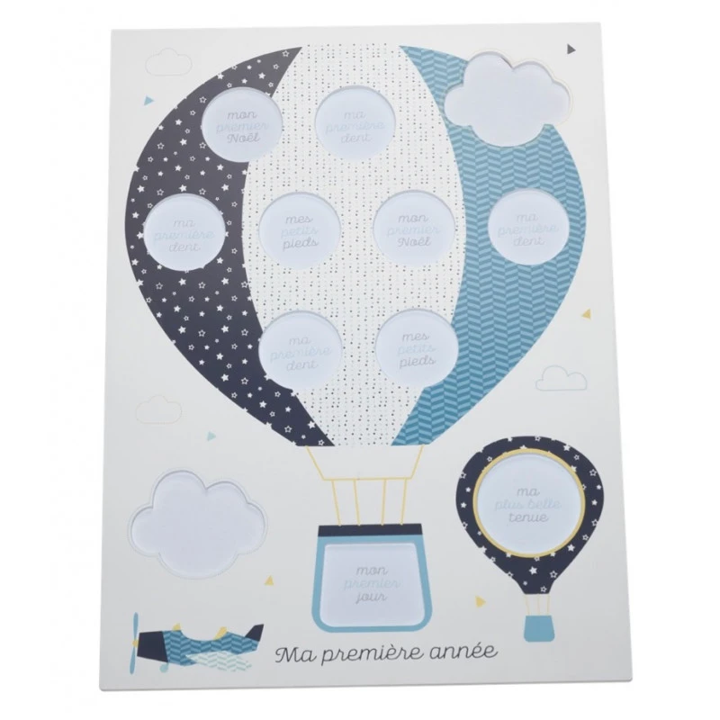 La première année de vie de bébé réunie dans ce beau pèle-mêle aux couleurs de la collection New Lazare de Sauthon. Les 12 vues de ce pèle-mêle New Lazare permettront aux parents de garder un souvenir des grands et des plus petits moments de la première année de leur enfant. Accroché au mur ou posé simplement sur un meuble, ce joli tableau bleu ciel, turquoise et bleu marine, illustré de deux belles montgolfières, sublimera à souhait le décoration de la chambre de bébé. Une idée cadeau originale, à glisser sans hésitation dans votre liste de naissance.