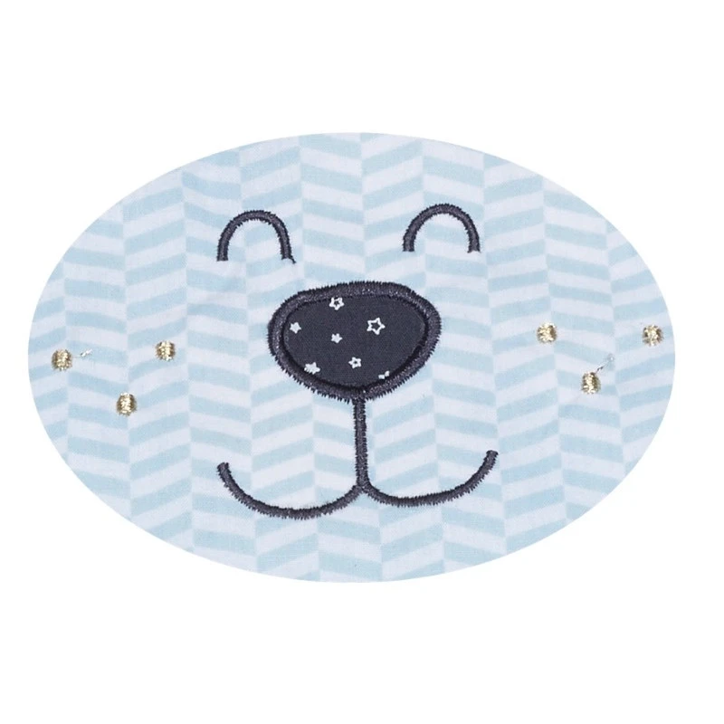 Coloris : bleu ciel, turquoise, liseret bleu marine. Motif ourson aviateur.