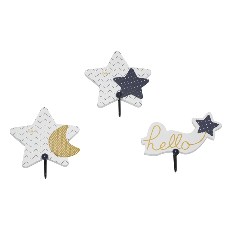 Ces jolies patères Sauthon assorties à la collection Hello seront de parfaits objets pour votre décoration et très pratiques pour accrocher blouson, bonnet et écharpe. Dans les tons de blanc, bleu et jaune, elles sont composées de jolies petites étoiles ! A la fois sobres et graphiques, les patères Hello apporteront une jolie note ludique.