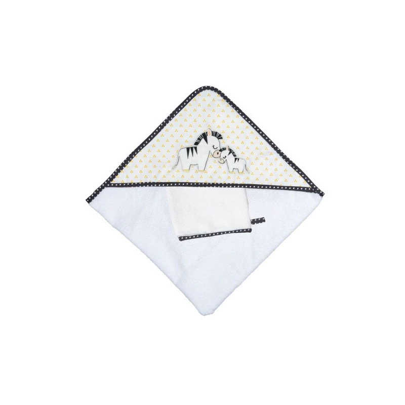 Réalisée dans une magnifique éponge absorbante blanche, la cape de bain Sauthon Pluche et Pompon est agrémentée d’un imprimé de délicats motifs jaunes dorés sur la capuche, et décorée par la présence du zèbre Pluche et de son petit, tout de noir et blanc vêtus. Ces couleurs contrastées sont d’ailleurs rappelées sur le biais qui entoure la cape, ainsi que sur le gant de toilette coordonné fourni.