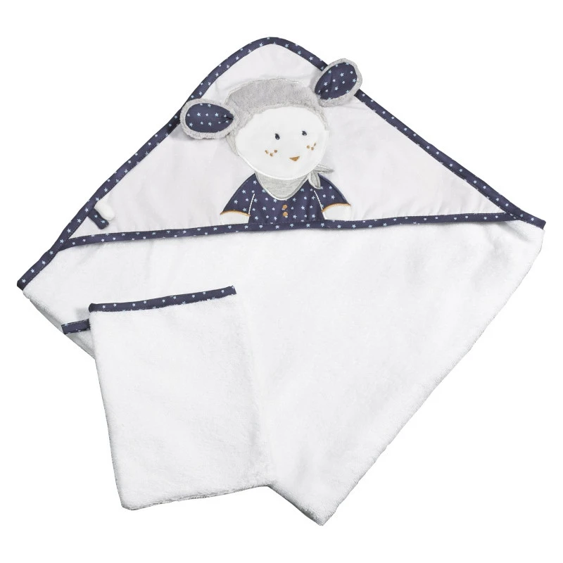 L’adorable thème Merlin vous présente son coffret bain. Sauthon a imaginé un gant accompagné d’une cape de bain au design simple mais efficace : éponge blanche et coutures décorées de tissus bleu foncé à pois. Mais ce n’est pas tout ! La capuche de la cape est décorée de l’adorable Merlin le mouton. Il compte bien veiller sur le bon déroulement de la sortie de bain de bébé ! Présentée dans un joli coffret au logo Sauthon, cette parure de bain est un incontournable des listes de naissances.