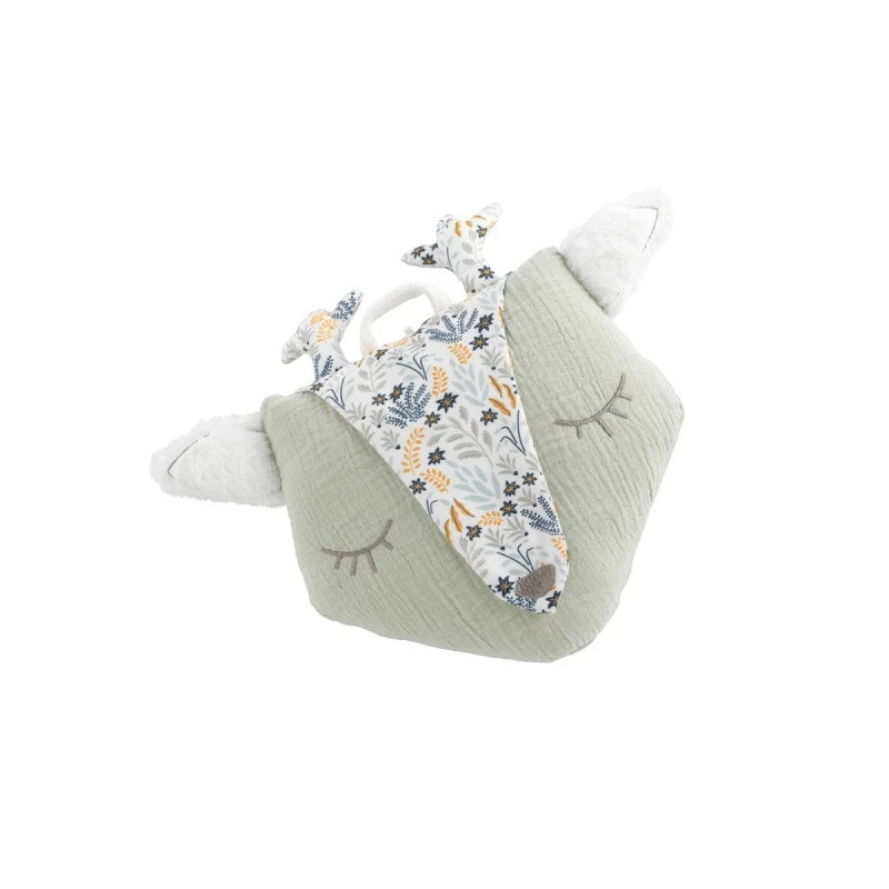 La suspension Promenons-nous de Sauthon associe une tendre couleur vert sauge avec un imprimé végétal délicat, aux tons naturels. Vous serez charmé par le bel animal, attendrissant avec ses yeux endormis, ses oreilles blanches, toutes douces et ses bois multicolores. Placé au-dessus du lit de votre enfant, il veillera sur son sommeil !