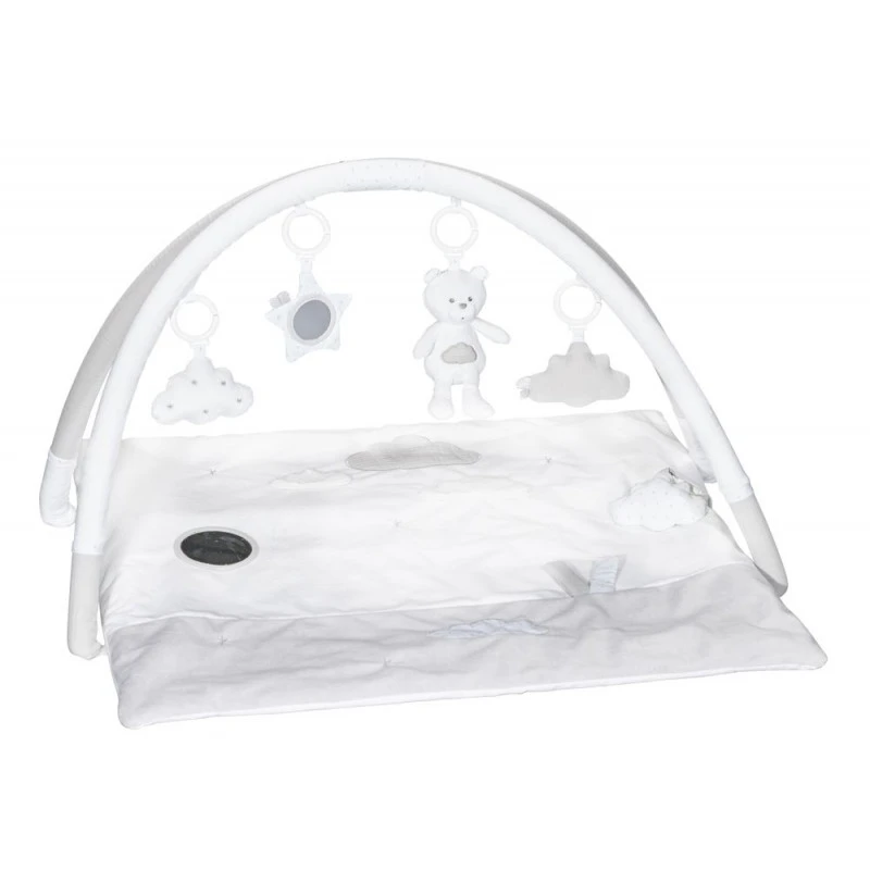 Le tapis d’Éveil assorti au thème Lily par Sauthon est parfaitement adapté pour stimuler les sens de l’enfant grâce aux différentes couleurs et jouets qui le constituent. Tous les jeux d’éveil peuvent être détachés des arches et utilisés comme peluches lorsque bébé aura grandi. Installé confortablement, sur son tapis molletonné, bébé pourra jouer et s’éveiller avec de multiples activités : des miroirs, des hochets, des peluches, etc… Dans les tons de blanc et gris, on y retrouve le beau petit ours du thème, une petite étoile et deux jolis nuages. Vous pourrez par la suite utiliser le tapis d’éveil sans les arches comme tapis pour amortir les chutes du quatre patte ou des premiers pas grâce à ses arceaux démontables… Super idée cadeau !