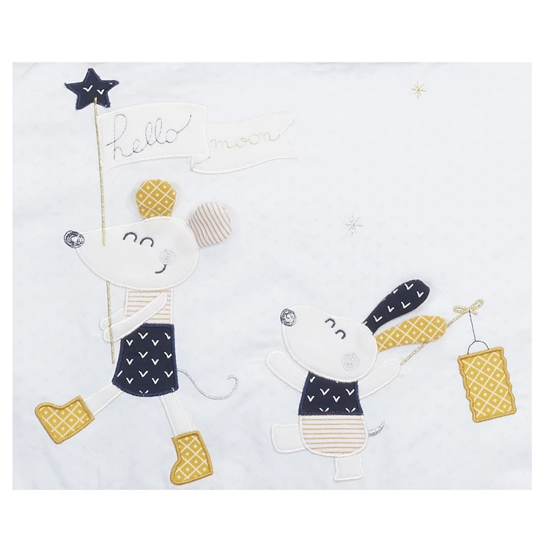 Découvrez la superbe collection Hello par Sauthon. Dans les tons de bleu marine, jaune et blanc, son adorable petite souris accompagnera bébé dans toutes ses aventures et ses plus jolis rêves. Avec un pied dans la lune et l’autre dans les étoiles, la collection Hello a tout pour plaire et plonge la chambre de votre tout petit dans son univers plein de rêves étoilés. Vous y retrouverez tous les objets nécessaires pour créer un univers cosy et confortable : Tour de lit, édredons, housse de couette, gigoteuses, pyjamas, matelas à langer, mobile, tapis d’éveil, sortie de bain, doudous et peluches… et plein d’autres articles !