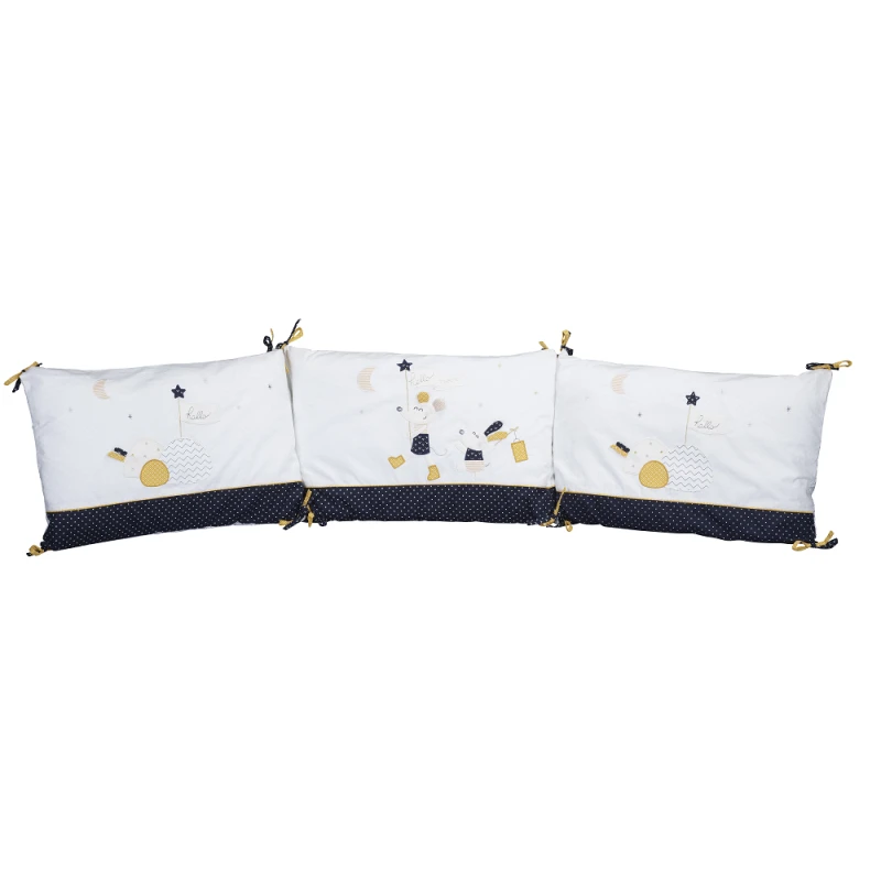 Contemporain et graphique, le tour de lit assorti au thème Hello par Sauthon garantit une douceur et une sĂ©curitĂ© maximale Ă l’enfant. Il protège bĂ©bĂ© des courant d’air et par sĂ©curitĂ©, lui Ă©vite de passer ses bras ou ses jambes Ă travers les barreaux du lit. Moelleux, le tour de lit Hello apportera un grand confort Ă bĂ©bĂ© lorsqu’il se blottira aux parois de son lit. Dans les tons de bleu marine, blanc et jaune, on y retrouve tous les personnages du thème : la souris et le chien de la Happy family sont en route pour un voyage autour du monde et dans l’espace! Indispensable, n’oubliez pas de l’ajouter sur votre liste de naissance !
