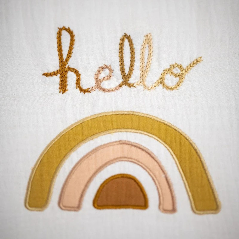 La marque française Sauthon a choisi de donner à ce tour de lit un look résolument tendance, en associant une tendre couleur unie écrue, d’un côté, avec quelques touches jaune et orangé, et un bel imprimé de l’autre côté parsemé de petits arc-en-ciel…